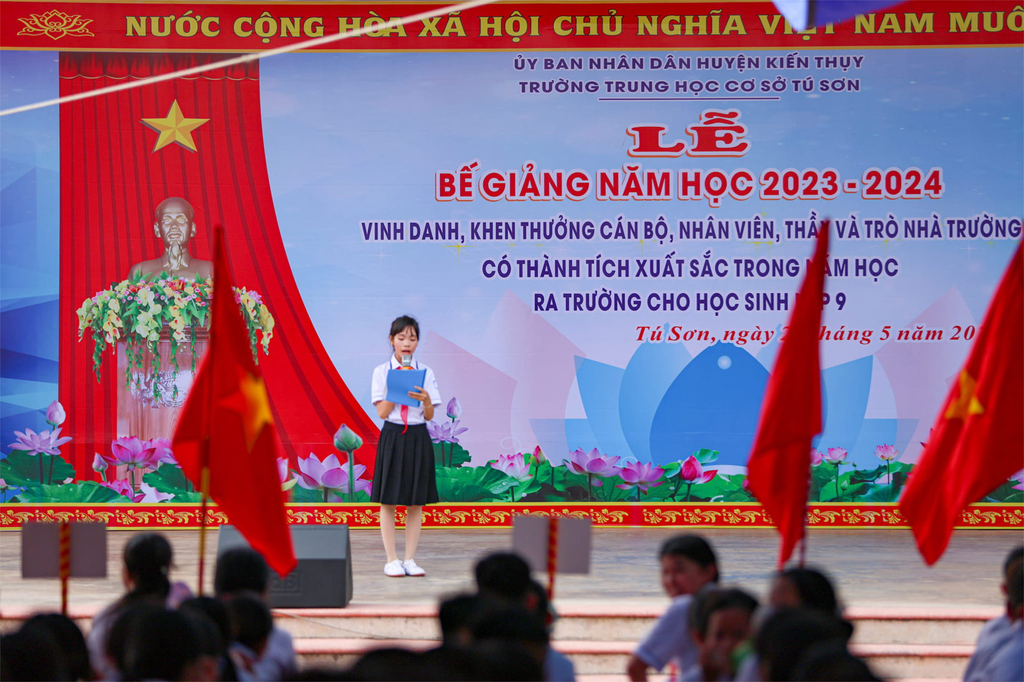 Thực hiện kế hoạch năm học, chiều ngày 28/05 trường THCS Tú Sơn đã long trọng tổ chức Lễ Bế giảng năm học 2023 – 2024. Tham dự buổi lễ, về phía lãnh đạo địa phương có ông Nguyễn Hữu Thắng – Bí thư đảng ủy xã Tú Sơn; ông Đồng Duy Cường – Phó bí thư, Chủ tịch UBND xã; các đại biểu đại diện cho đảng, chính quyền, các ban ngành đoàn thể địa phương, các tổ chức chính trị xã hội; về phía nhà trường, có Thầy Nguyễn Tiến Thùy – Hiệu trưởng nhà trường; ông Bùi Đình Nam –Trưởng ban đại diện CMHS nhà trường, cùng toàn thể quý thầy cô giáo, cán bộ nhân viên, quý bậc phụ huynh đại diện của 22 lớp và gần 1000 học sinh của của nhà trường đã tham dự đông đủ.