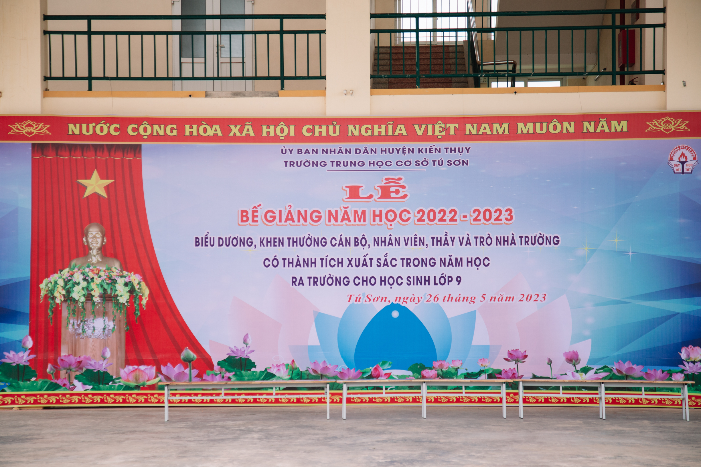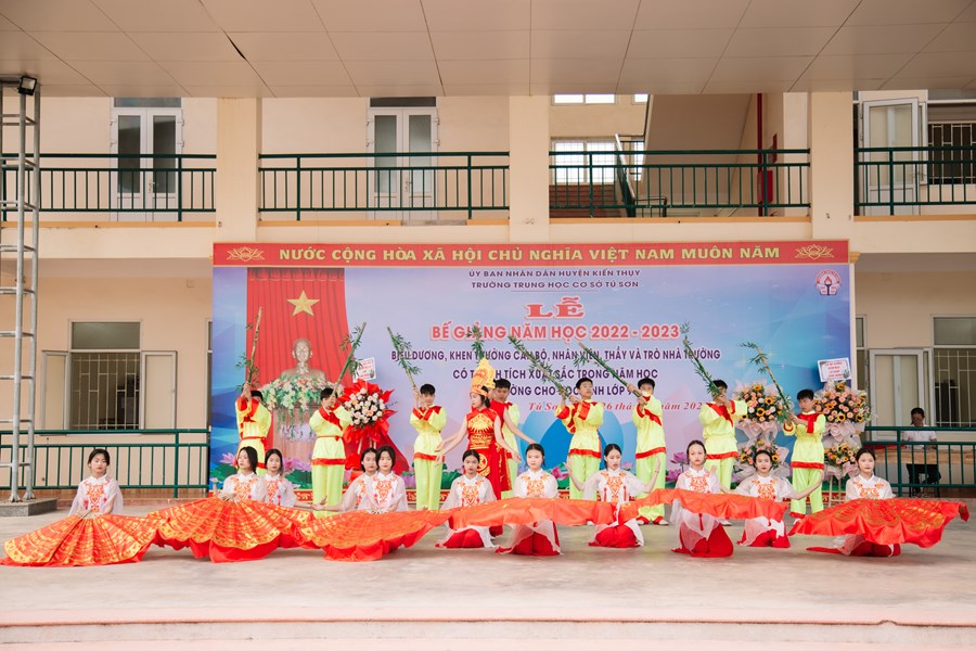 Thực hiện kế hoạch năm học, chiều ngày 26/05 trường THCS Tú Sơn đã long trọng tổ chức Lễ Bế giảng năm học 2022 – 2023. Tham dự buổi lễ, về phía lãnh đạo địa phương có ông Nguyễn Hữu Thắng – Bí thư đảng ủy xã Tú Sơn; ông Đồng Duy Cường – Phó bí thư, Chủ tịch UBND xã; các đại biểu đại diện cho đảng, chính quyền, các ban ngành đoàn thể địa phương, các tổ chức chính trị xã hội; về phía nhà trường, có Thầy Nguyễn Tiến Thùy – Hiệu trưởng nhà trường; ông Bùi Đình Nam –Trưởng ban đại diện CMHS nhà trường, cùng toàn thể quý thầy cô giáo, cán bộ nhân viên, quý bậc phụ huynh đại diện của 19 lớp và gần 800 học sinh của của nhà trường đã tham dự đông đủ.