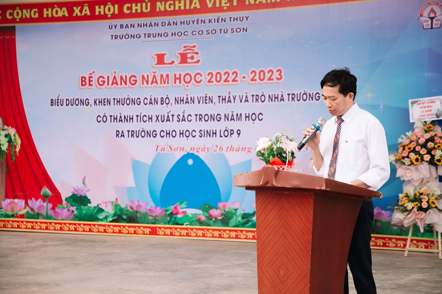 Thầy giáo Nguyễn Tiến Thùy - Hiệu trưởng nhà trường đọc diễn văn bế giảng, tuyên bố kết thúc năm học 2022-2023