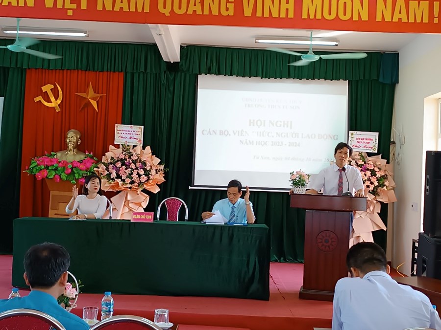 Nhằm phát huy quyền dân chủ của cán bộ, giáo viên, công nhân viên và tổng kết nhiệm vụ năm học 2023- 2024, đề ra phương hướng nhiệm vụ cho năm học mới, chiều ngày 04/10/2023, tại hội trường, Trường THCS Tú Sơn đã long trọng tổ chức Hội nghị cán bộ, viên chức, người lao động năm học 2023-2024.