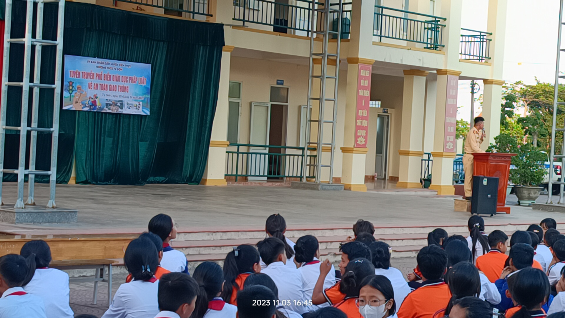 Thực hiện kế hoạch của nhà trường, chiều ngày 3/11/2023, trường THCS Tú Sơn đã phối hợp với công an huyện Kiến Thụy, công an xã Tú Sơn tuyên truyền, phổ biến những nội dung trọng tâm, cốt lõi của các văn bản pháp luật quy định về trật tự an toàn giao thông cho CB, GV, HS nhà trường.